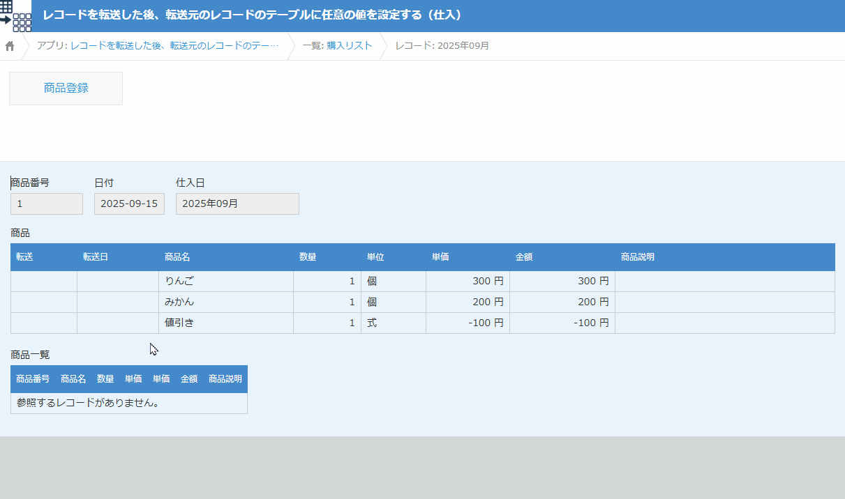 - 仕入アプリのテーブル情報から、商品アプリにレコードを作成した後、仕入アプリのテーブルに転送チェックと転送日を自動記録する