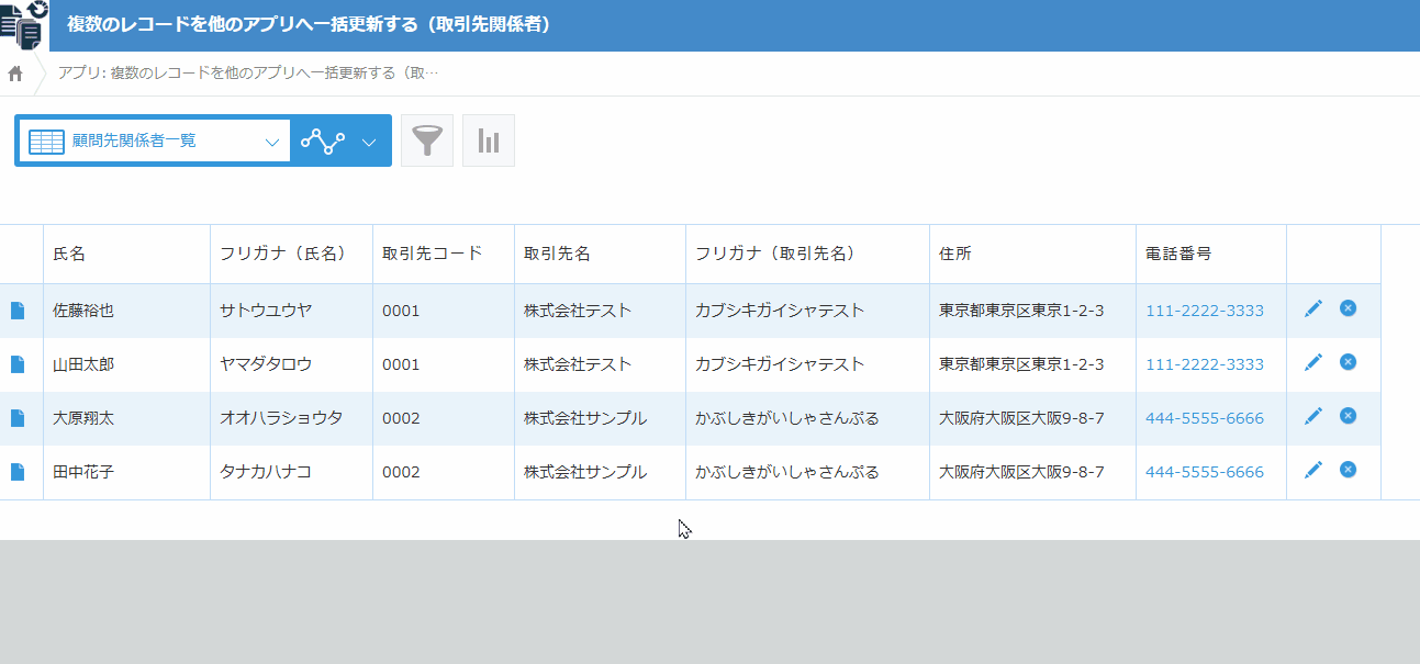 取引先アプリ(マスタ)の情報を元に、それに紐づく取引先関係者アプリの情報を一括更新しました