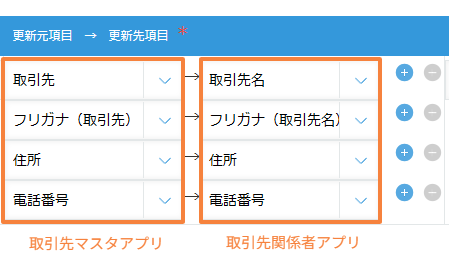 - 最後に、更新元項目と更新先項目の設定を行います。
