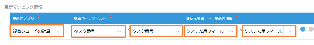 更新キーフィールドはレコード番号、更新元項目と更新先項目はシステム用フィールドを選択しましょう。