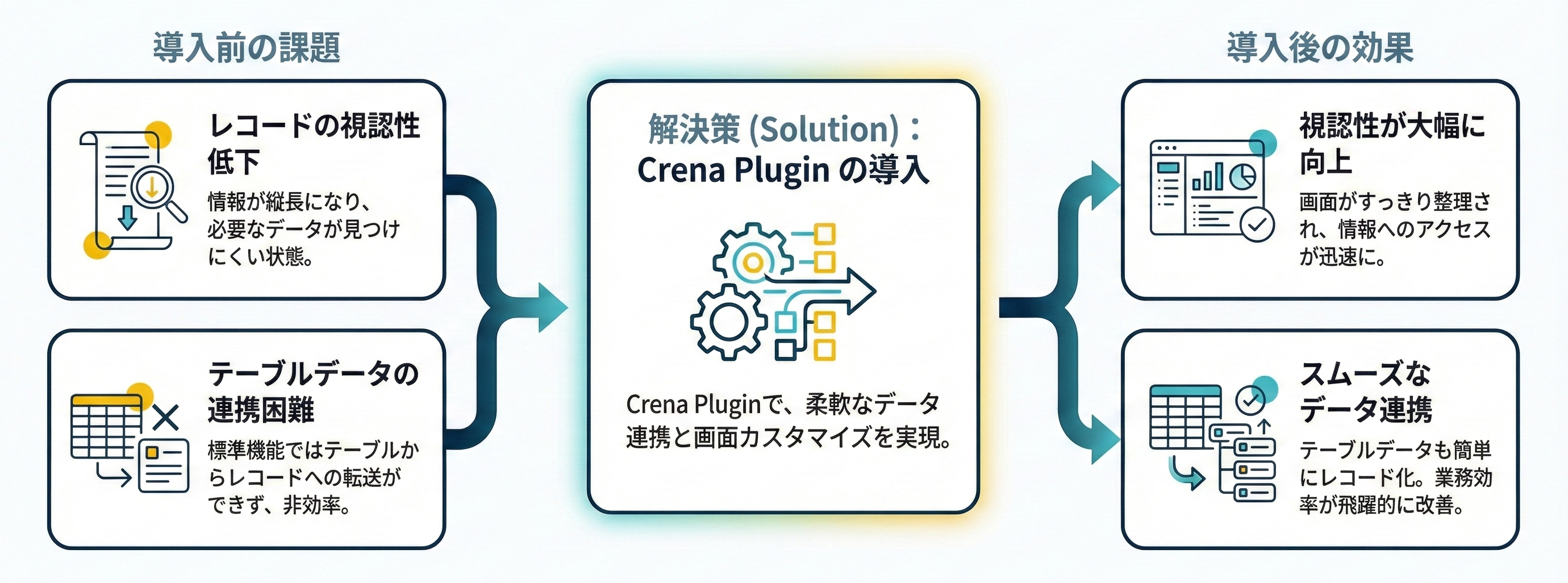 そこで同法人では、これらの課題を解決するために「Crena Plugin」を導入し、課題の解決と効率化の実現に成功しました。