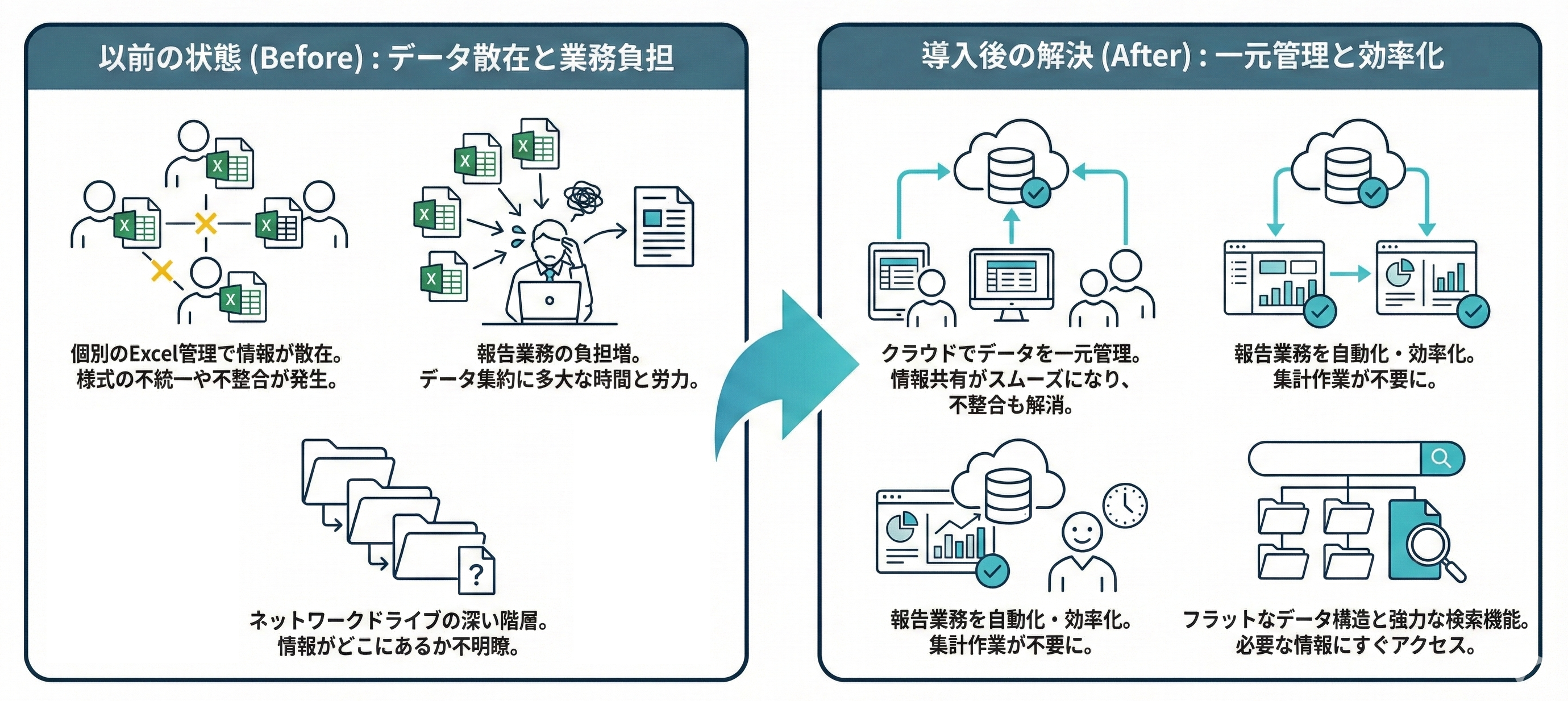 さらに、報告業務では、個別のExcelから案件データを集め、1人でまとめる作業が必要であり、非常に大変だったということです。