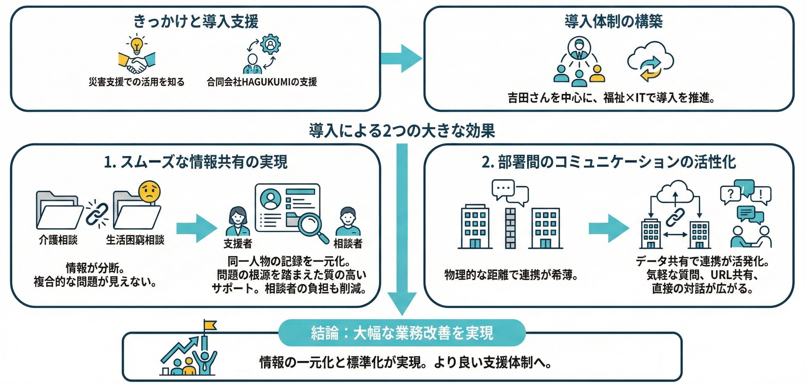 そして、「福祉×IT」を掲げるHAGUKUMIの支援を受けながら、吉田さんを中心にkintone導入を実現しました。