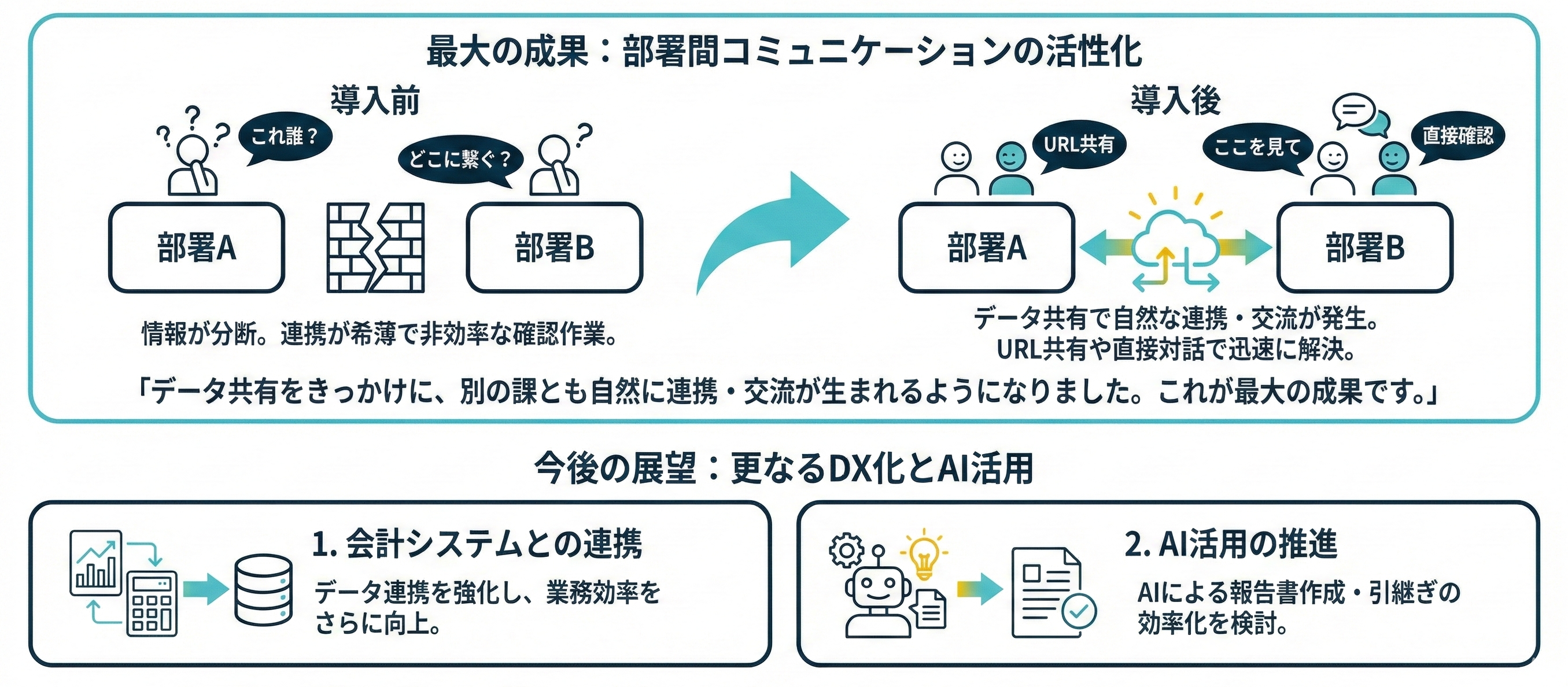 吉田さんによれば、「データ共有をきっかけに部署間のコミュニケーションの活性化したこと」がkintone導入による最大の成果であるそうです。