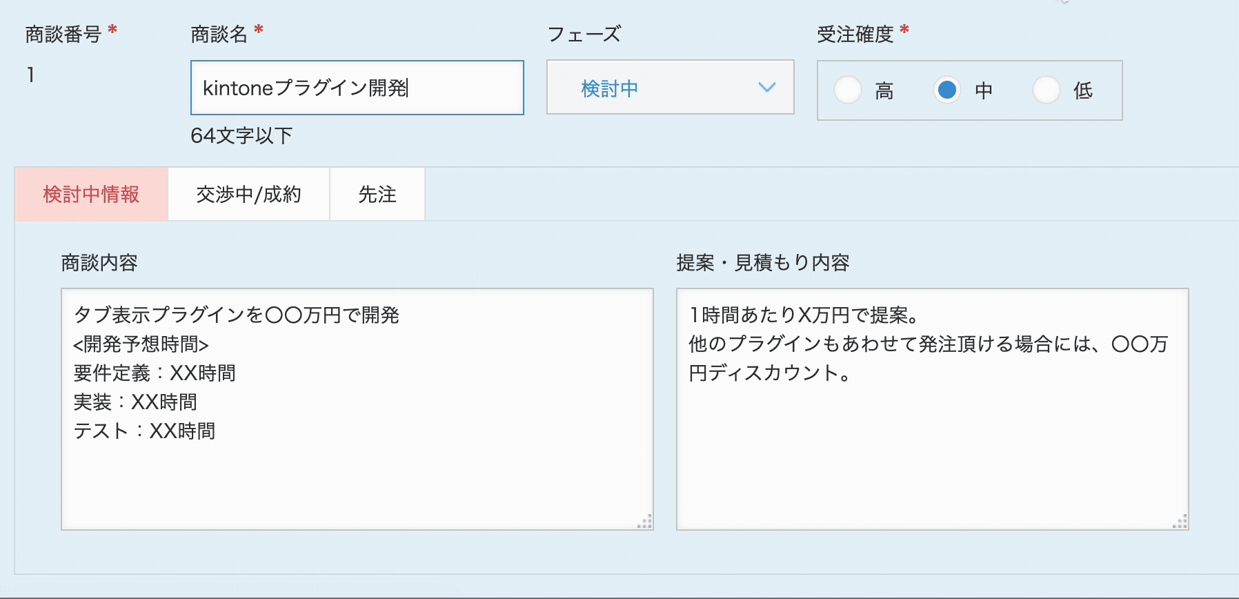 相談業務アプリにタブ表示プラグインを導入することで、縦長になってしまったレコード内の情報をカテゴリごとにタブで分類し、見やすい画面を実現しました。