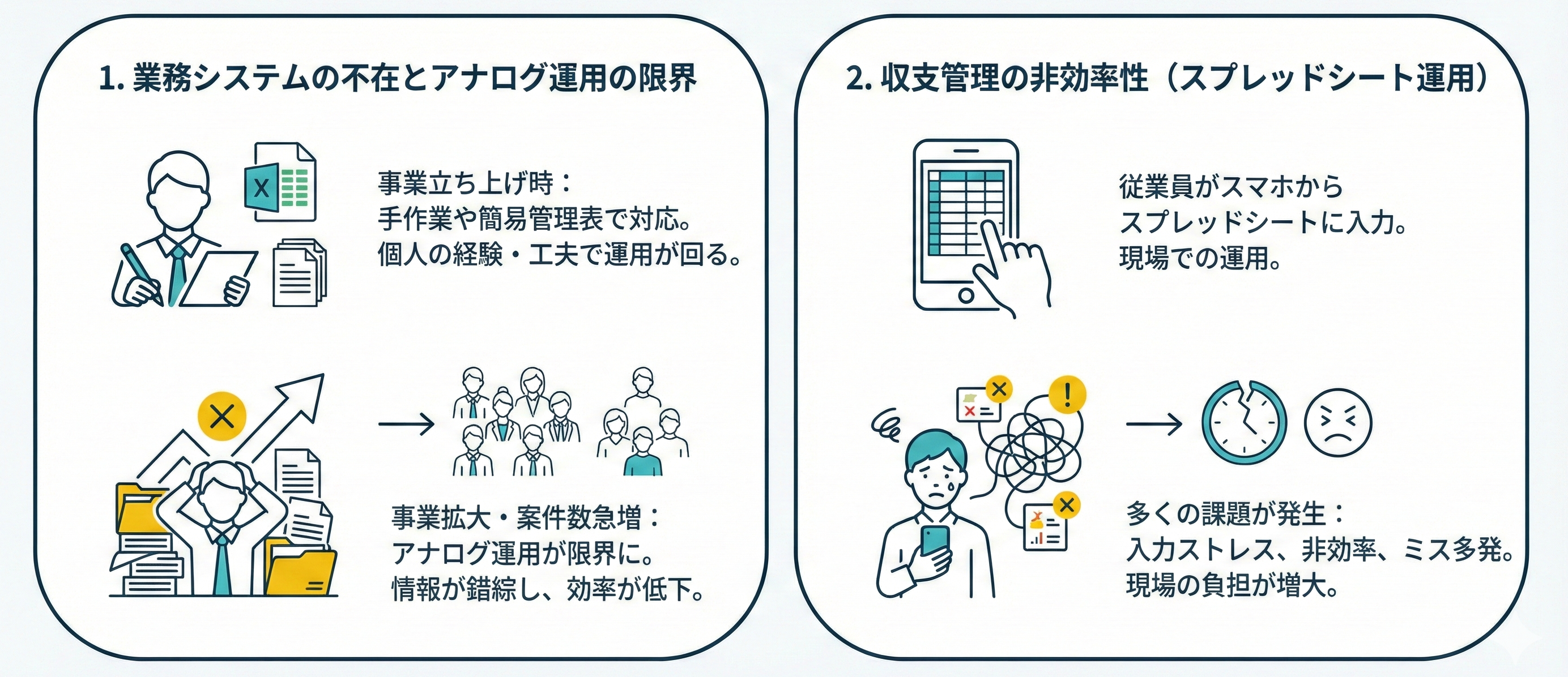 しかし、事業が順調に拡大し、扱う案件数や関わるスタッフ数、顧客数が急増するにつれて、従来のアナログな運用では限界が露呈し始めました。