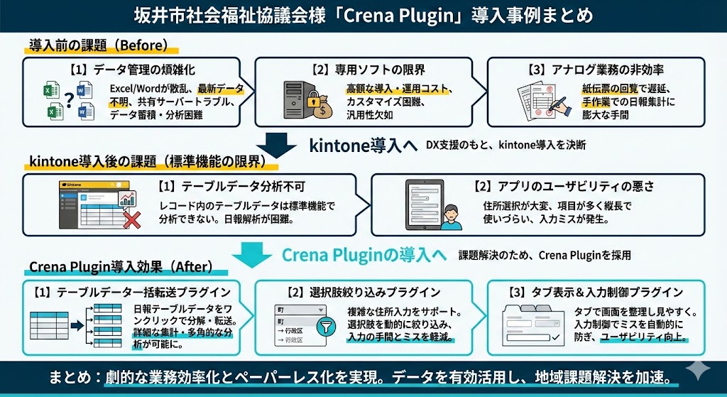 坂井市社会福祉協議会では、「kintone」と「Crena Plugin」の導入によって、劇的な業務効率化を実現しました。