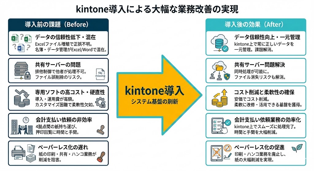 そして、同法人では、kintoneの導入によって、大幅な業務改善を実現しました。具体的には