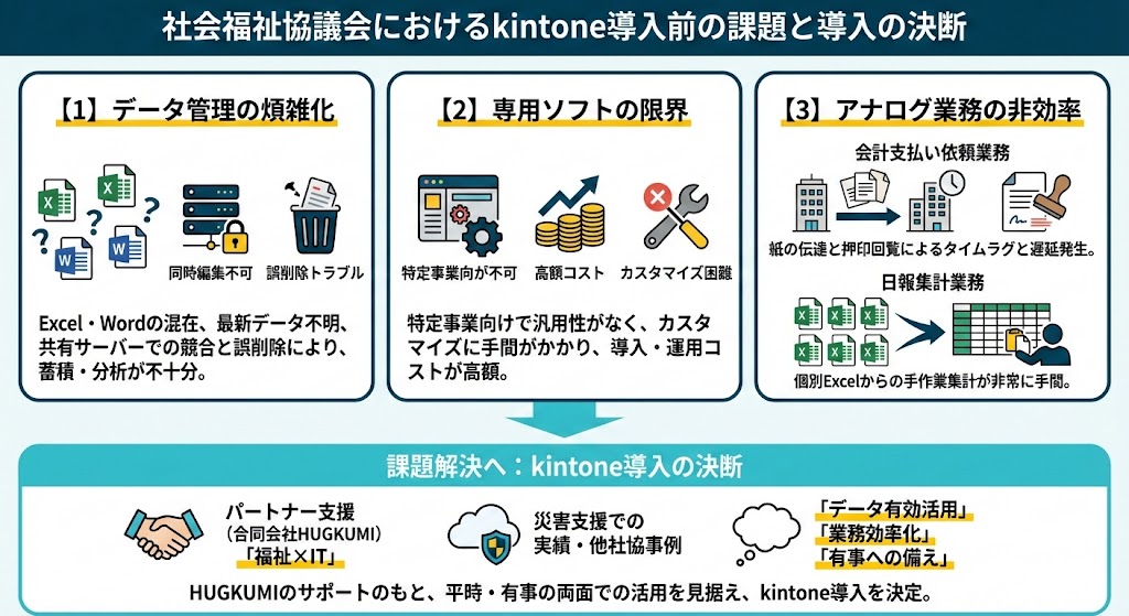さて、そんな同法人では、以前まで「データ管理の煩雑化」「専用ソフトの限界」「アナログ業務の非効率」などの課題に悩まされてきました。