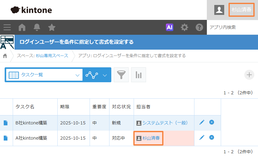 ログインしているユーザーのユーザー情報を条件書式を変更できます。