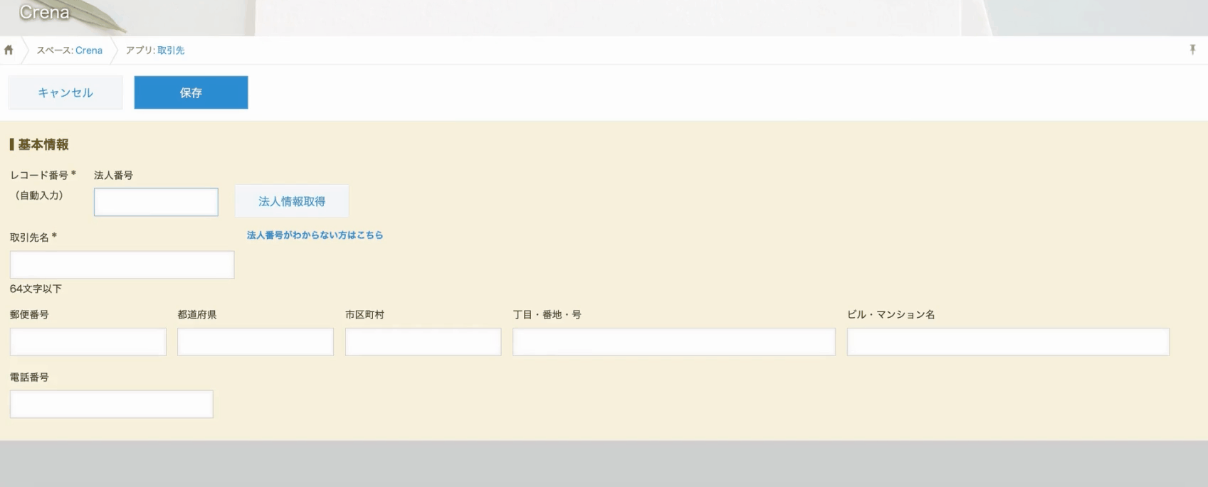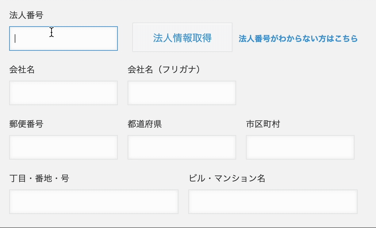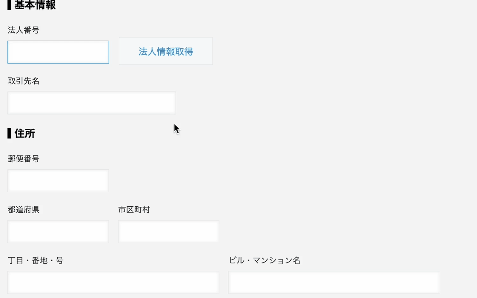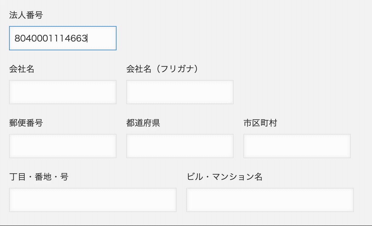 法人番号を入力するだけで、正確な法人名や住所を自動取得し、フィールドに反映できます。
