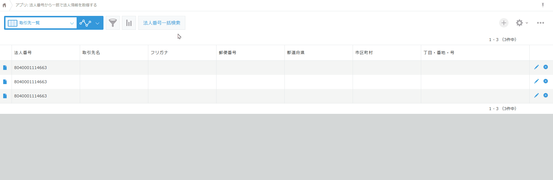 複数のレコードを対象に法人情報を一括で取得し、フィールドに反映できます。