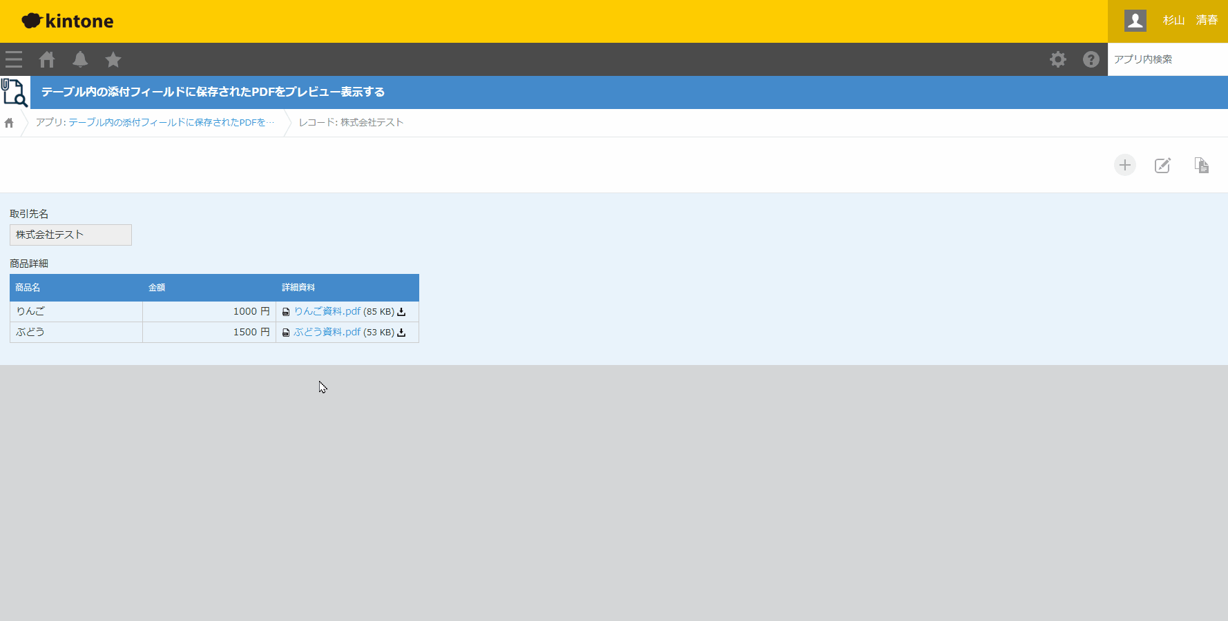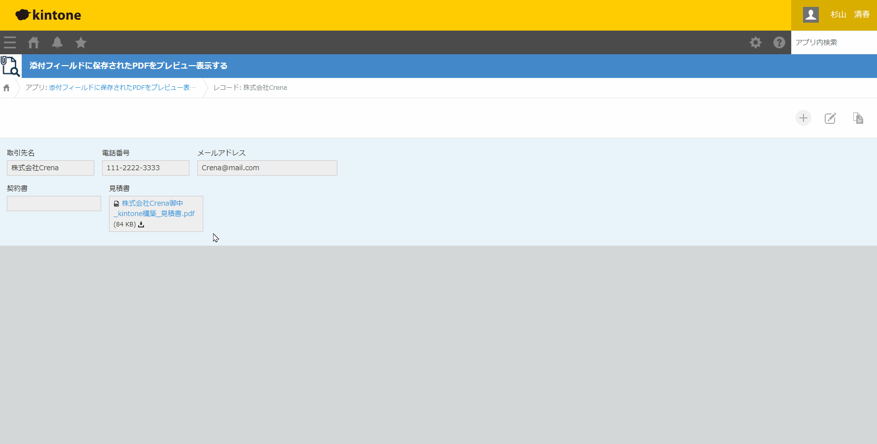 添付ファイルフィールドに保存されたPDFを、ダウンロードすることなく画面上で直接表示できます。