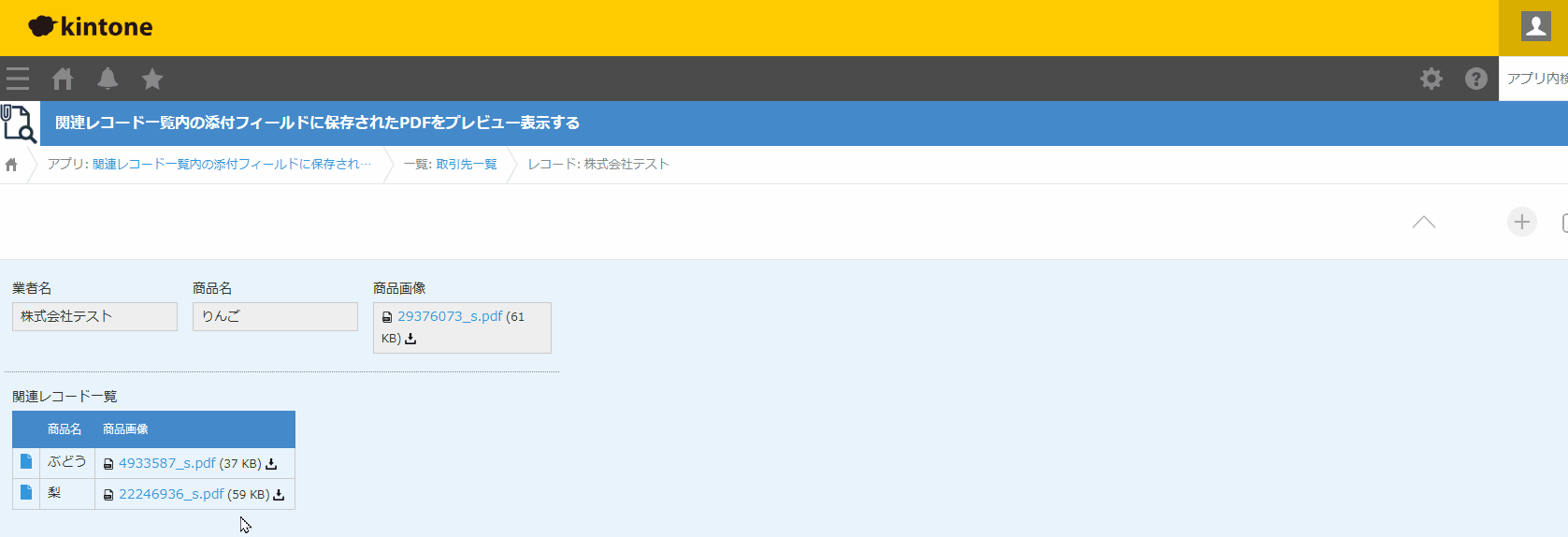 関連レコード内に保存された添付ファイルフィールドのPDFを、その場でプレビュー可能です。