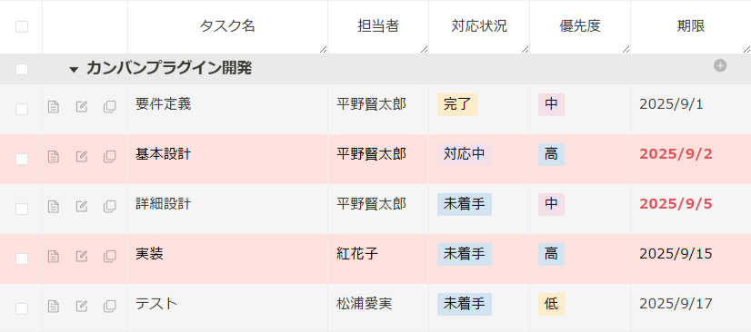 レコードを 担当者・ステータス・日付などでグルーピング表示したり、条件に応じて自動で色分け することで、ひと目で状況を把握できます。