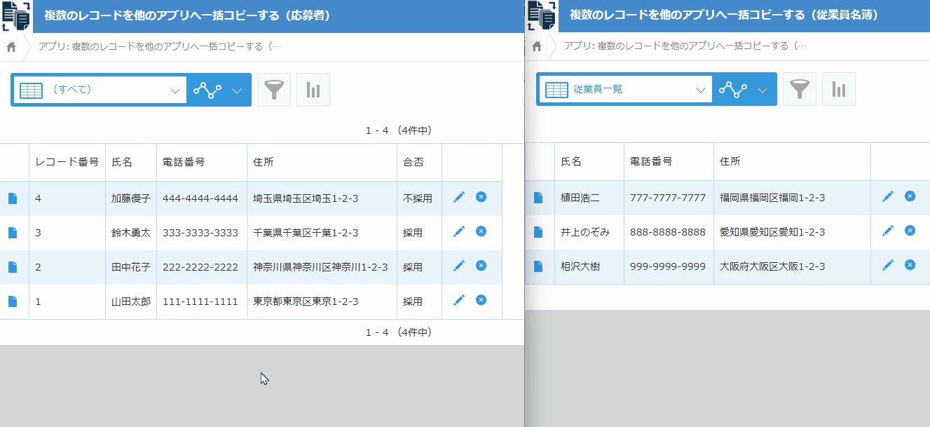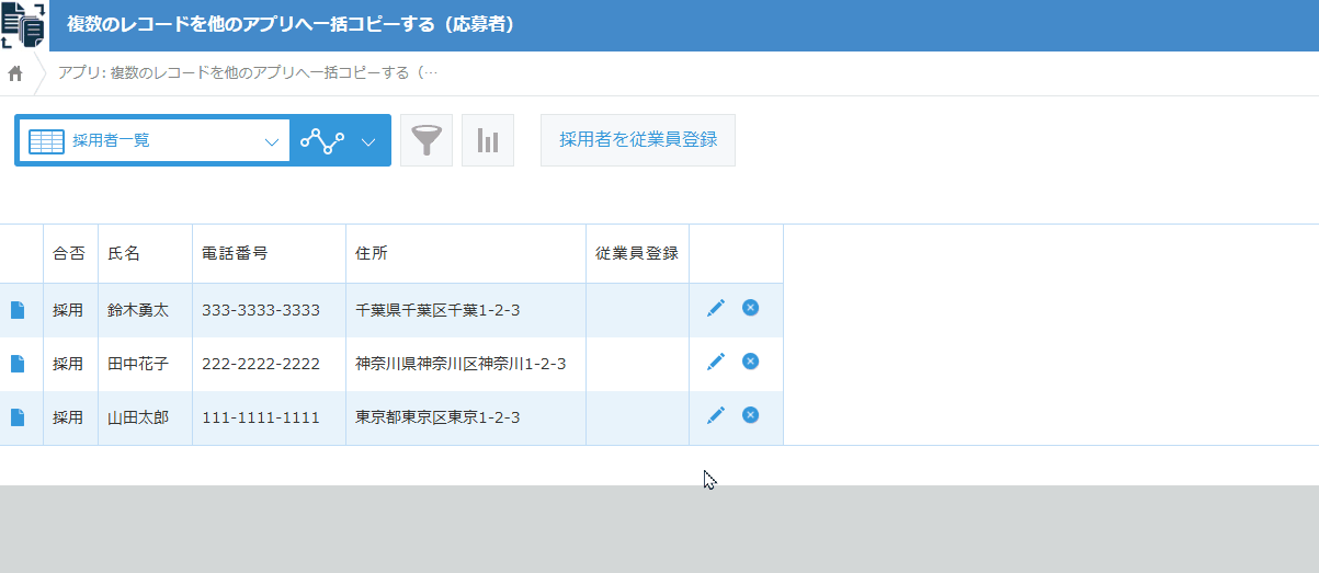 例:契約アプリの50件を、売上アプリへ一括コピー。