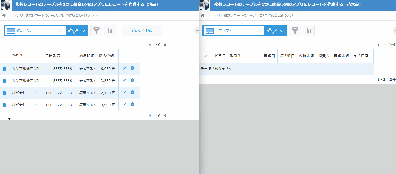 例:納品アプリの「納品明細」を取引先ごとにまとめ、請求書レコードを作成。